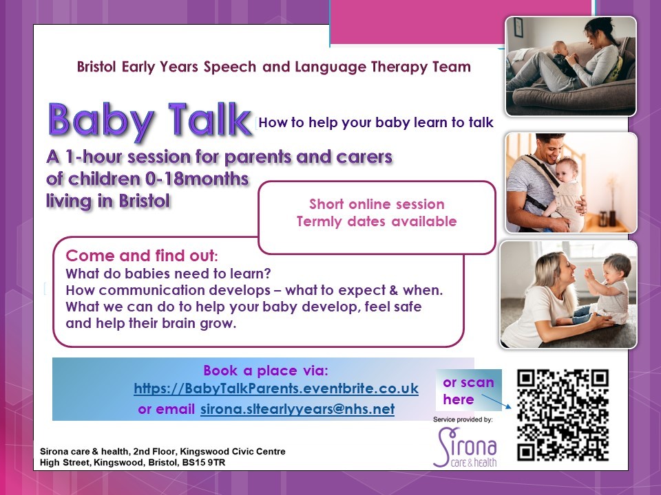 Baby Talk sessions can be booked at https://www.eventbrite.co.uk/e/baby-talk-parents-and-carers-tickets-163631244457 and Toddler Talk sessions can be booked at https://toddlertalk.eventbrite.co.uk/