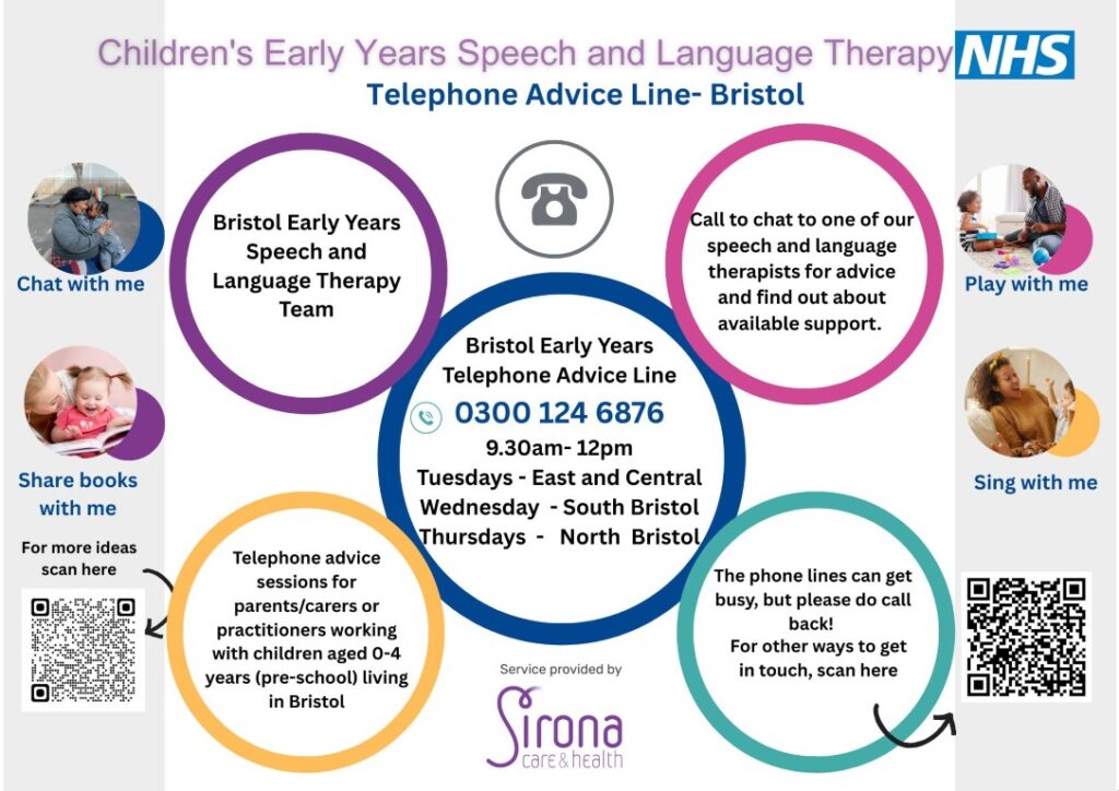 Parents and carers can also access the Bristol Early Years Telephone Advice Line by calling 0300 124 6876 between 9.30am and 12pm. The line operates on Tuesdays for East and Central Bristol, Wednesdays for South Bristol and Thursdays for North Bristol. Speech and language therapists are available to chat and provide advice about supporting children aged 0-4 years.